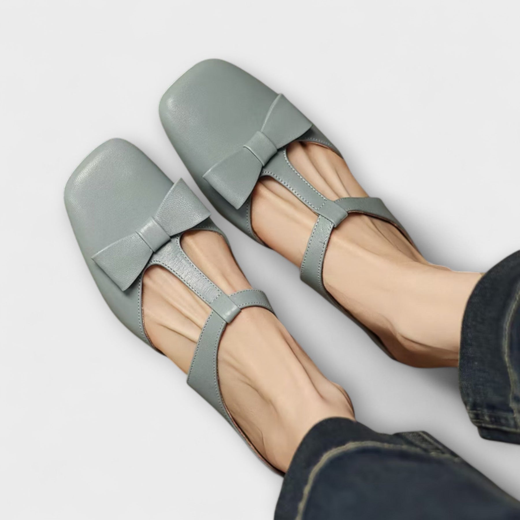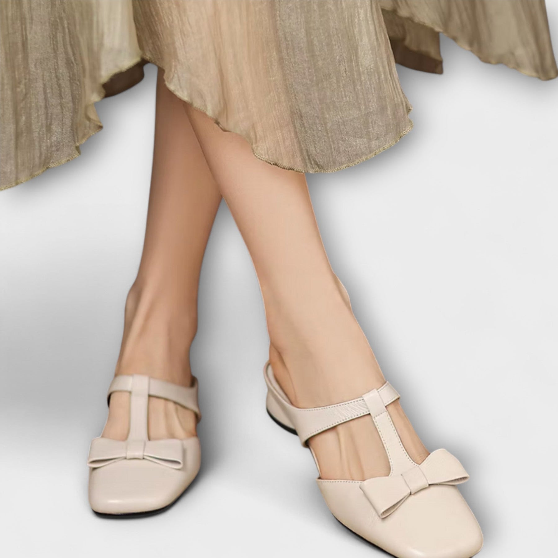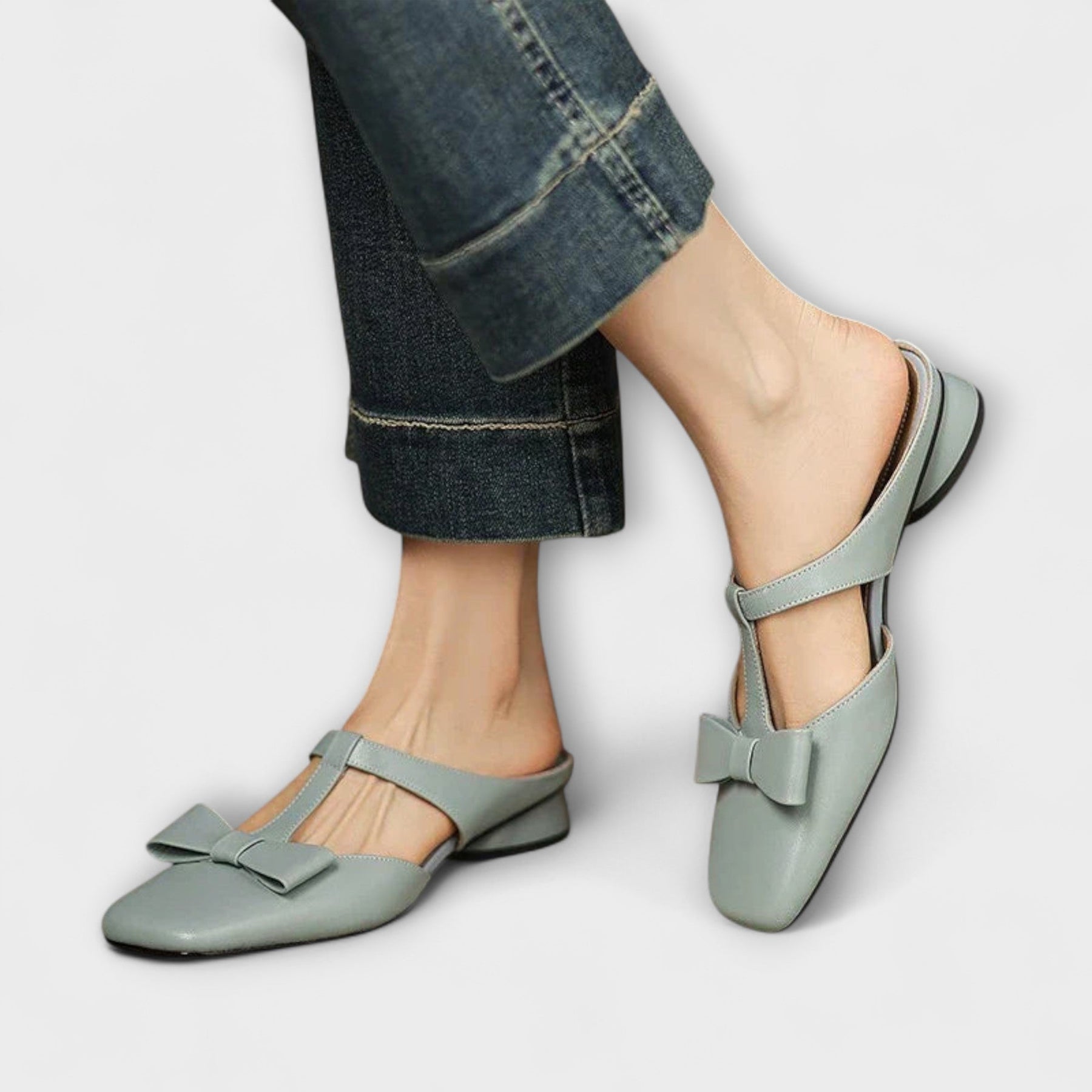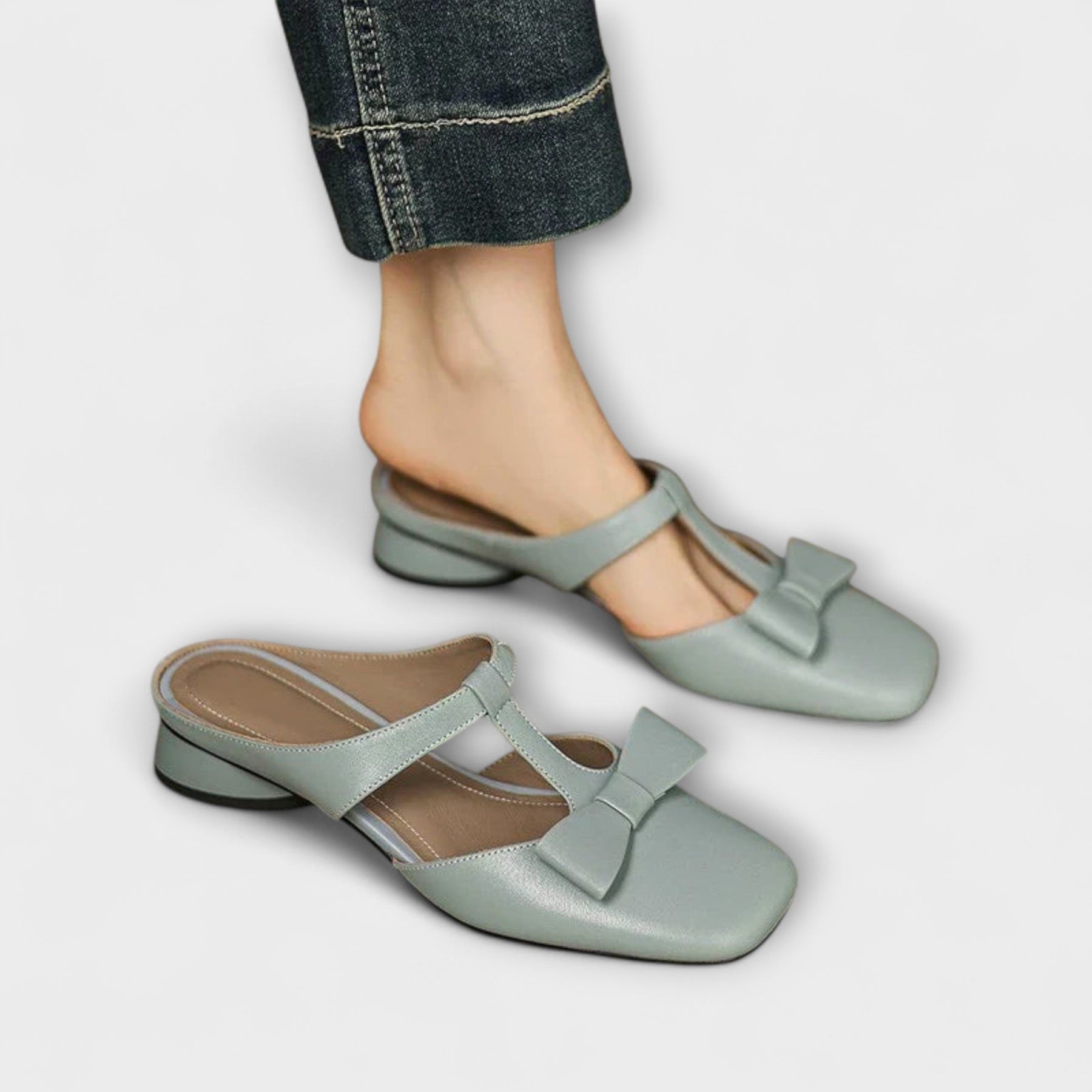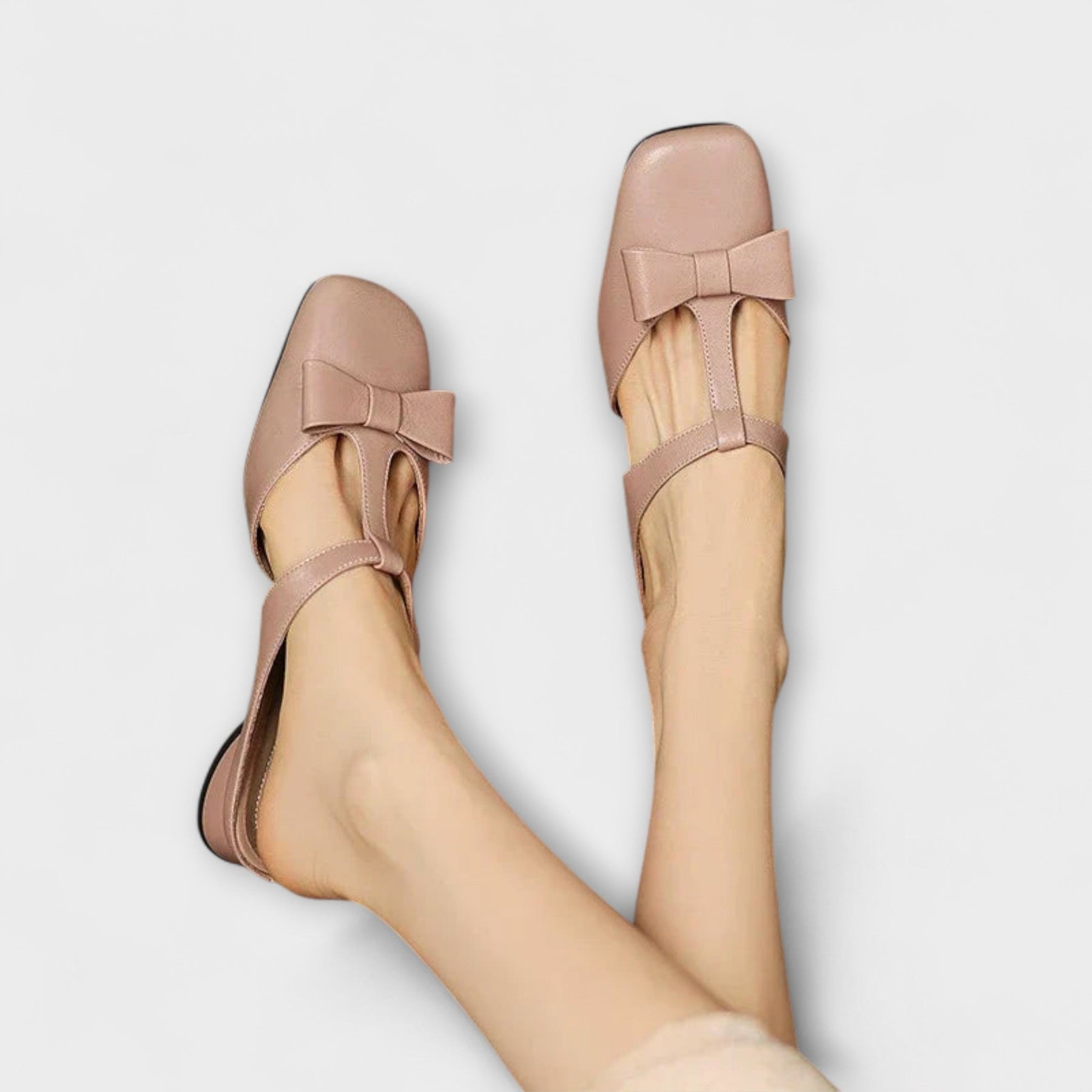 - Design: Quadratische Zehenform mit dekorativer Schleife und Rückenschnalle.