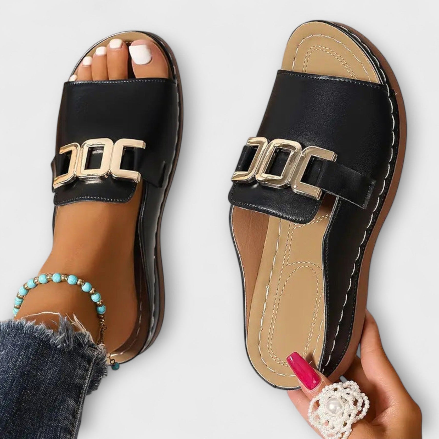 Schlüpfen Sie in den ganztägigen Komfort der Tinsley – Riemchen-Slides – wo Minimalismus auf Auffälligkeit trifft.